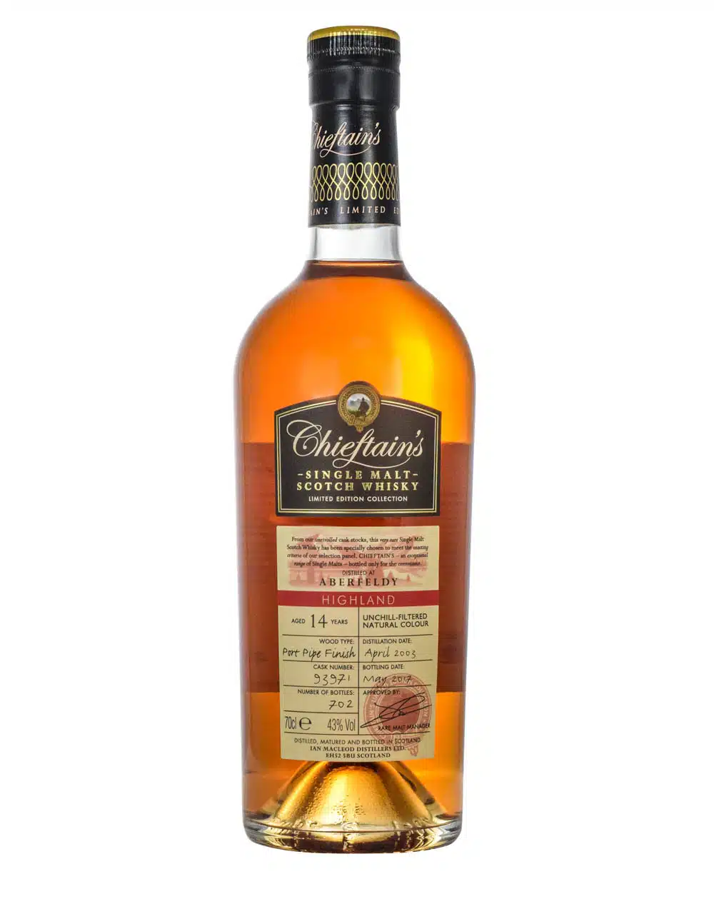 Aberfeldy 14 Years Old Chieftain’s 2003 Cask #93971 is a limited-edition Aberfeldy single malt, released by renowned independent bottler Ian Macleod for the Chieftain’s range. The whisky was distilled in April 2003 and matured for a total of 14 years. It was finished in a Port Pipe and bottled in May 2017 at 43%. The result is a light and fruity dram with notes of grapes, raspberries and soft caramel. One of 702 bottles.