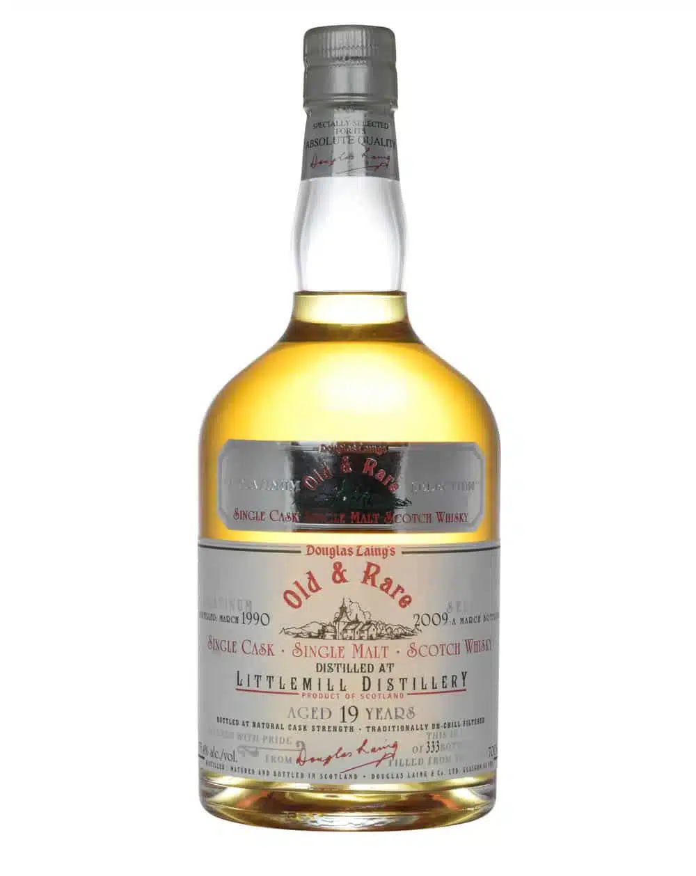 Littlemill 19 Years Old Old & Rare 1990 is a rare single cask malt from the closed Lowland distillery Littlemill. The whisky was distilled in March 1990 and matured for 19 years. It was bottled in March 2009 at a cask strength of 55.4%. Littlemill 19 Years Old Old & Rare 1990 was released by renowned independent bottler Douglas Laing as part of the Old & Rare range. The bottle comes in an elegant wooden box. Littlemill was the first and oldest licensed whisky distillery in Scotland. It was founded in 1772 on the border of the Lowlands and the Highlands. The distillery finally closed down in 1994 after its owners went bankrupt. The buildings were dismantled in 1997, and what was left burned down in 2004. Littlemill’s private cellar is now in the hands of the Loch Lomond distillery. Only 333 bottles of Littlemill 19 Years Old Old & Rare 1990 have been released.